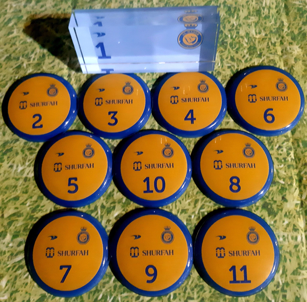 Contém 1 time com 10 jogadores em lentes de policarbonato de 45mm de diâmetro + goleiro oficial de acrílico + palheta e bolinha estilo pastilha.