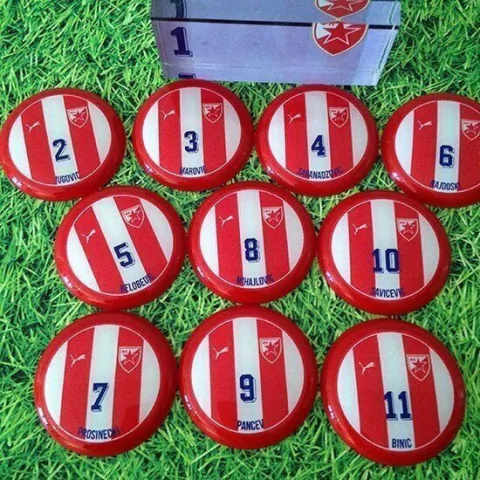 Contém 1 time com 10 jogadores em lentes de acrílico de 45mm de diâmetro + goleiro oficial de acrílico + palheta e bolinha de pastilha.