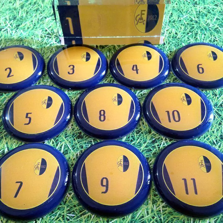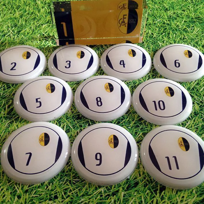 Contém 1 time com 10 jogadores em lentes de acrílico de 45mm de diâmetro + goleiro oficial de acrílico + palheta e bolinha de pastilha.