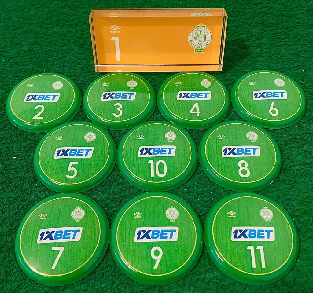 Contém 1 time com 10 jogadores em lentes de policarbonato de 45mm de diâmetro + goleiro oficial de acrílico + palheta e bolinha estilo pastilha.