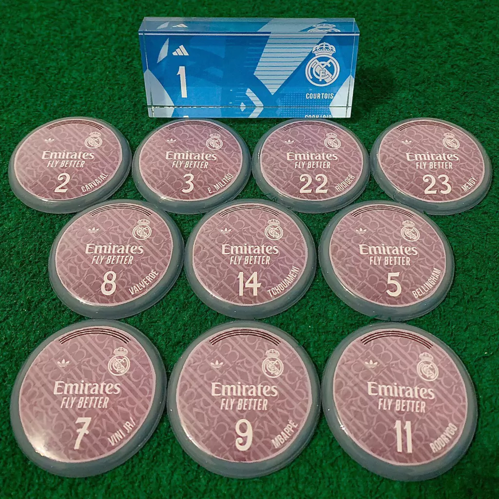 Contém 1 time com 10 jogadores em lentes de policarbonato de 45mm de diâmetro + goleiro oficial de acrílico + palheta e bolinha estilo pastilha.