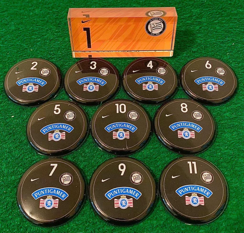 Contém 1 time com 10 jogadores em lentes de policarbonato de 45mm de diâmetro + goleiro oficial de acrílico + palheta e bolinha estilo pastilha.
